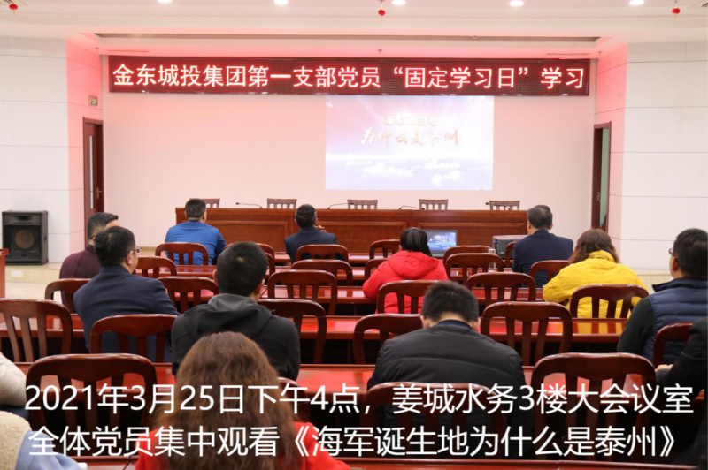 3月25日下午,金東集團第一黨支部組織黨員固定學習日活動,觀看視頻《海軍誕生地為什么是泰州》