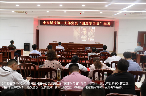 5月25日下午,金東集團第一黨支部組織黨員固定學習日活動,觀看視頻《百煉成鋼》:《遵義會議》、《延安整風》、《新中國的成立》,