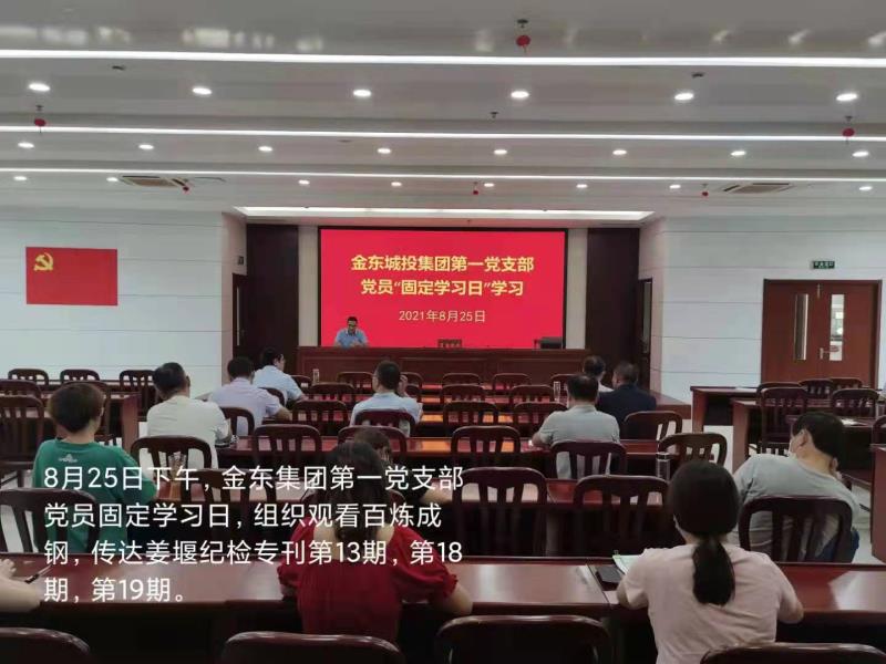 8月25日下午,金東集團第一黨支部組織黨員固定學習日活動,觀看視頻《百煉成鋼》:《一國兩制》、《小康目標》、《科教興國》,